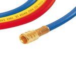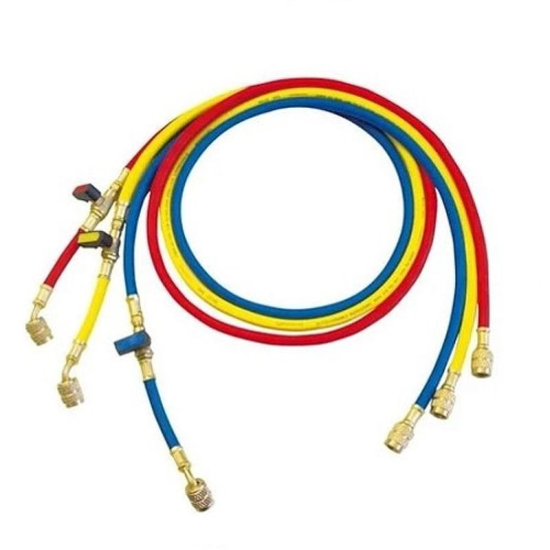 Cada mangueira tem 1500 mm de comprimento e é equipada com válvula de esfera, além de conexões de 1/4" com adaptadores para 5/16". A codificação por cores (azul, vermelho, amarelo) facilita a identificação, garantindo um trabalho mais seguro e sem confusão.