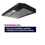 A dupla filtragem inclui um filtro de carvão ativado, que remove odores indesejados, e telas em alumínio lavável, que ajudam na retenção de gordura. Além disso, o depurador possui uma luminária integrada para melhor visibilidade na cozinha.
