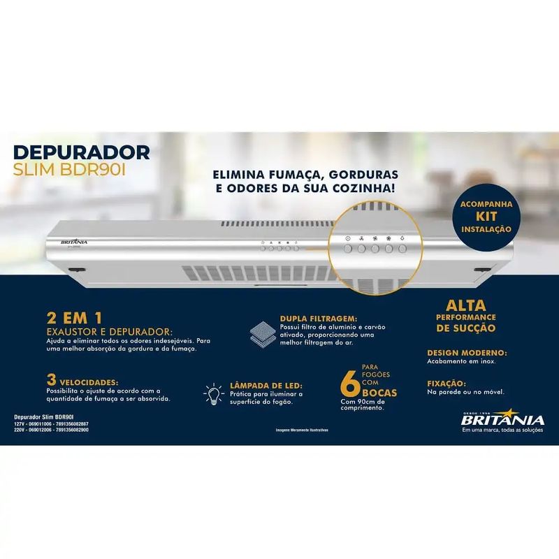 Depurador e Exaustor Britânia 2 em 1 Slim 3 Velocidades BDR90I Inox 220V