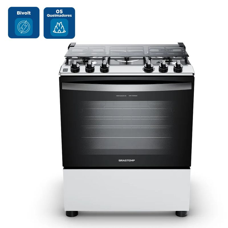 O Fogão de Piso Brastemp 5 Bocas Com Botões Removíveis e Aro Protetor Branco BFS5NDB