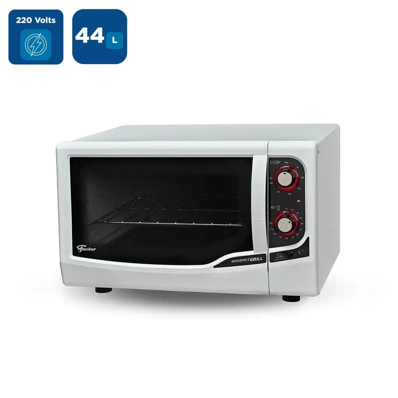 O Forno Elétrico Fischer 44 Litros Gourmet Grill Branco - 220 Volts assa, doura, tosta gratina e aquece , apresenta controle automático de temperatura, controle independente da resistência superior e a resistência inferior é acionado pelo termostato, timer de até 120min com aviso sonoro garantindo praticidade na hora de cozinhar.