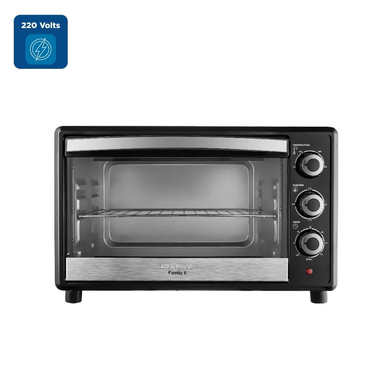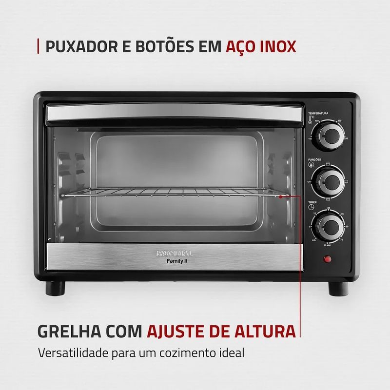O Forno Mondial 42 Litros Family II Preto FR42 você pode fazer aquela receita tamanho família sem preocupação. O forno elétrico Family II FR-42 da Mondial possui capacidade para 42 litros e é perfeito para aquecer, cozinhar, tostar, assar, gratinar e grelhar de maneira eficiente. Possui controle de temperatura, grelha com regulagem de altura, timer de 90 minutos com desligamento automático e alta potência de 1600W.