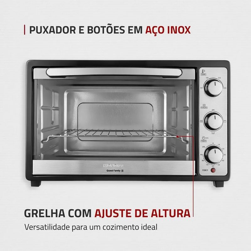 O Forno Mondial 52 Litros Grand Family II Preto FR52 você pode fazer aquela receita tamanho família sem preocupação. O forno elétrico Grand Family II FR-52 da Mondial possui capacidade para 52 litros e é perfeito para aquecer, cozinhar, tostar, assar, gratinar e grelhar de maneira eficiente. Possui controle de temperatura, grelha com regulagem de altura, timer de 90 minutos com desligamento automático e alta potência de 1800W.