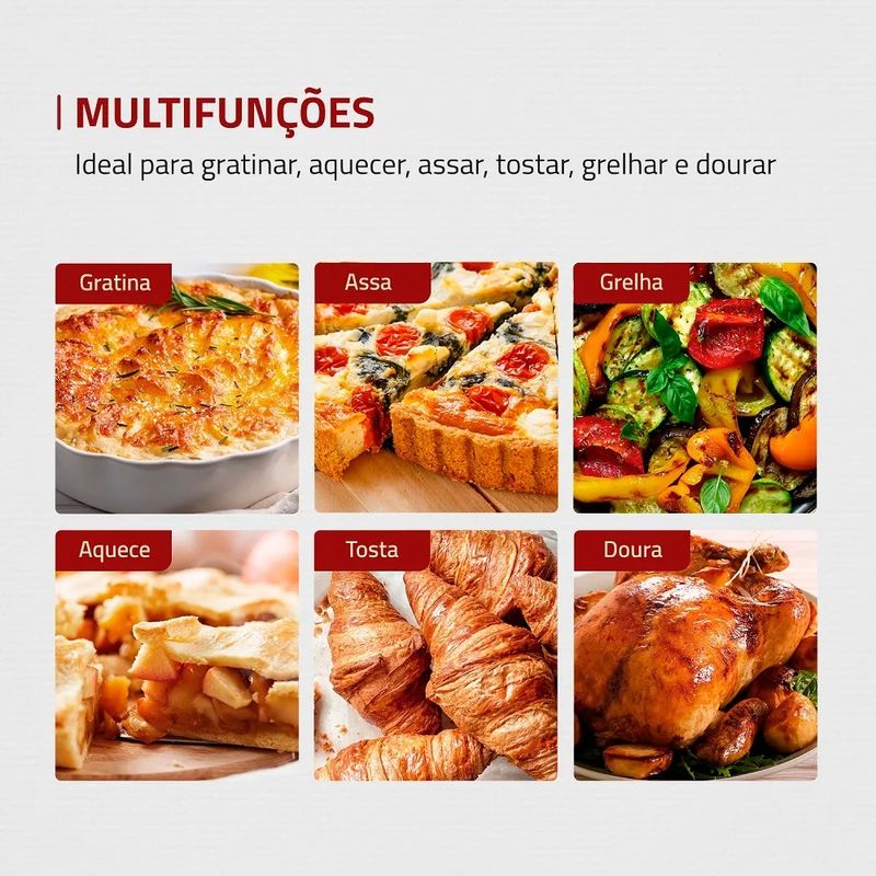 Ideal para aquecer, cozinhar, tostar, assar, gratinar e grelhar de maneira rápida e eficiente.
