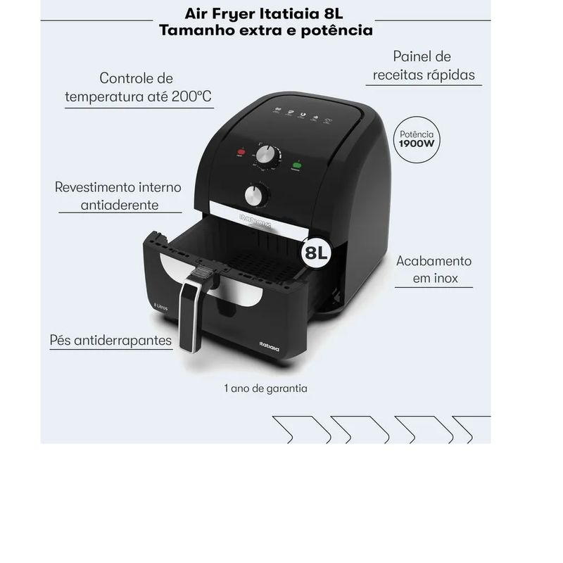 Leve mais inovação para sua cozinha com a fritadeira sem óleo Air Fryer Itatiaia 8L, ideal para famílias grandes ou para quem gosta de preparar porções generosas com mais rapidez, saúde e eficiência. Com 1900W de potência, ela garante um preparo rápido e uniforme, sem necessidade de óleo e com muito mais sabor.