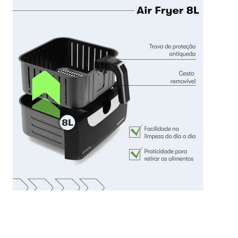 Air Fryer potente e espaçosa, com segurança, estilo e praticidade, o modelo AFITA1003 de 8 litros é a escolha ideal para elevar o nível das suas receitas do dia a dia.