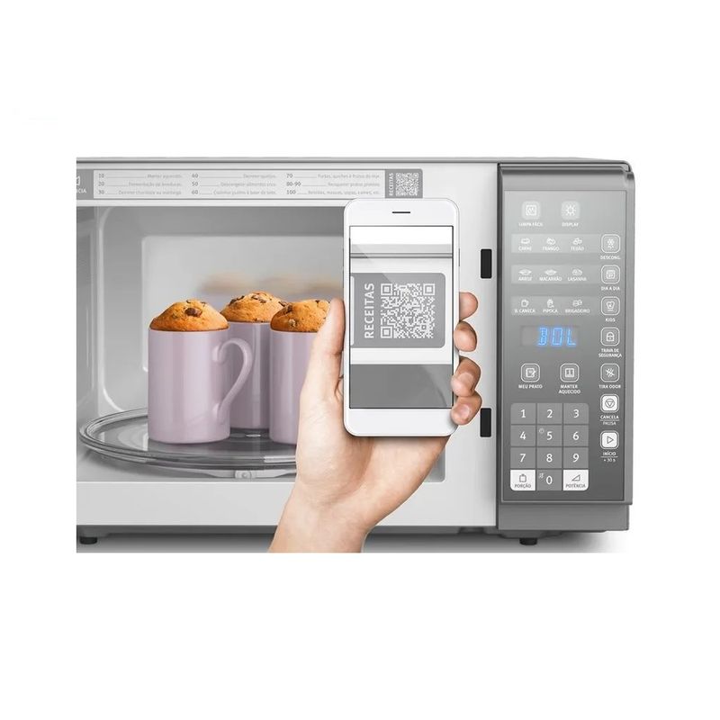 Possui função para saber como preparar receitas, mediante leitura de QR Code, utilizando o seu celular para ler o código gravado, mostra vídeos de passo a passo da receita. Conta a função para manter o prato aquecido, como se tivesse saído do forno naquele momento. Com função Tira Odor, que ajuda a reduzir odores dentro do Micro-ondas.