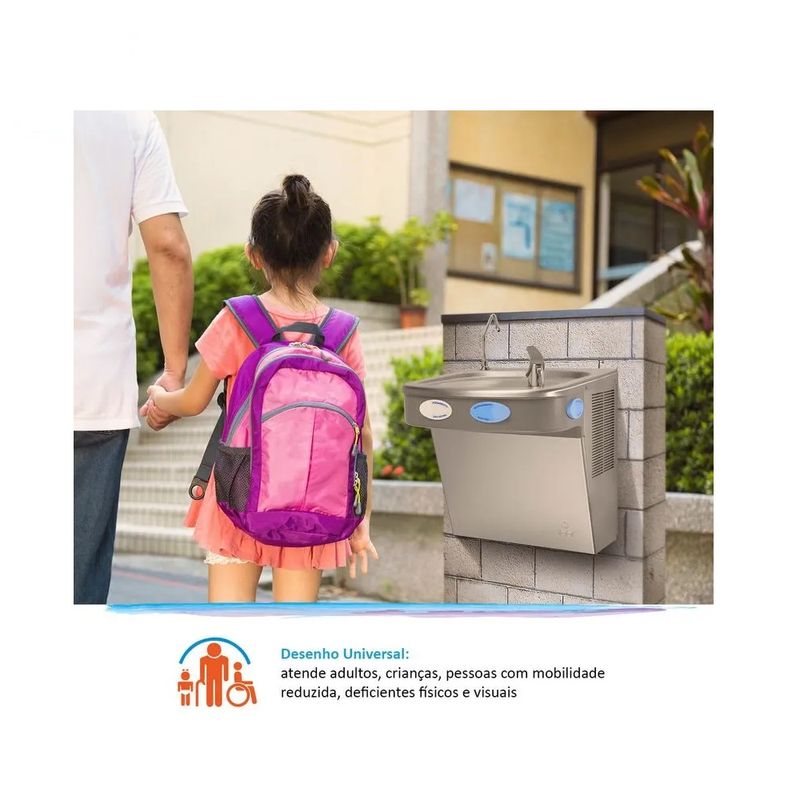 Características Gerais: • Eco compressor (gás R-134a não agride a camada de ozônio) • Refil Girou, Trocou: troque sem fechar o registro • Teclas em Braille • Jato para boca • Protetor bucal flexível • Regulagem do jato de água • Refil Bacteriostástico: controla a proliferação de bactérias • Elimina odores • Elimina sabores • Retém micropartículas presentes na água • Easy Clean (desmontável para higienização)** • Serpentina externa (fácil higienização) • Gabinete em chapa eletrozincada na cor prata • Tampo em aço inox 304 escovado • Depósito de água em aço inox 304 • Dreno para limpeza • Ralo sifonado • Fixação na parede •