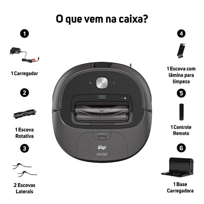 O Robô Aspirador de Pó Wap WCONNECT Preto Bivolt é um robô aspirador inteligente com conectividade via WiFi, é compatível com Amazon Alexa e Google Assistente, podendo ser acionado por comando de voz ou de qualquer lugar que esteja, e ainda possui aplicativo exclusivo para ter mais eficiência na limpeza.