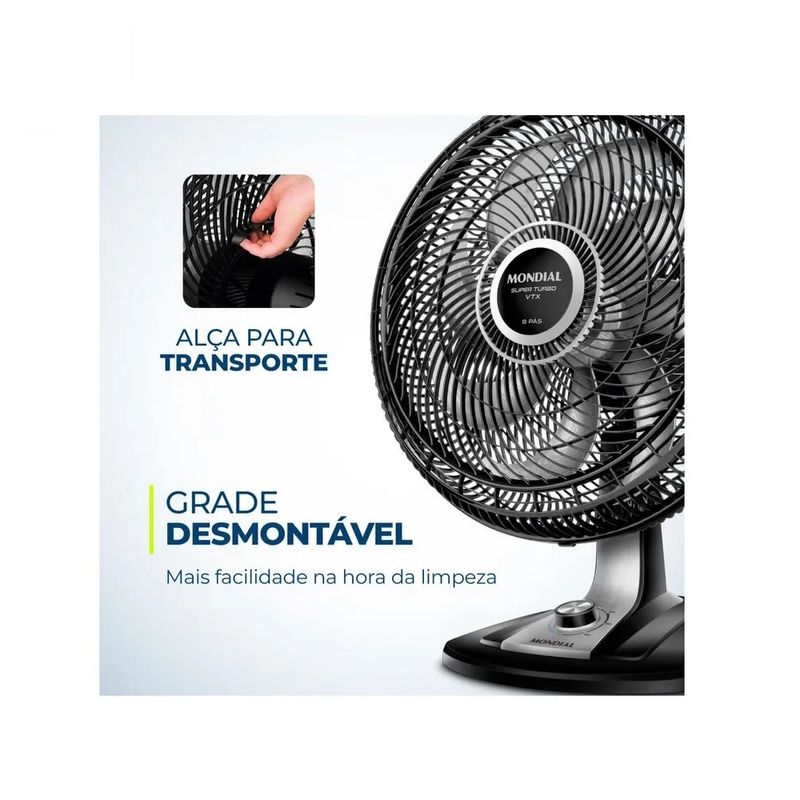 O ventilador de mesa Super Turbo VTX-40-8P possui 40 cm de diâmetro e hélice de 8 pás promove uma circulação de ar mais eficiente e garante mais frescor ao ambiente. O sistema de ventilação alia a potência para refrescar ao baixo nível de ruído, proporcionando o silêncio necessário para momentos de concentração e uma excelente noite de sono.